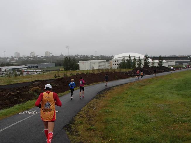 Suđurlandsbraut 10.29 Uhr / Km 19,9 Die Halle mit der weißen Kuppel ist die von Vortag bekannte Laugardalshöll. Dort gab es nämlich die Startnummern. |