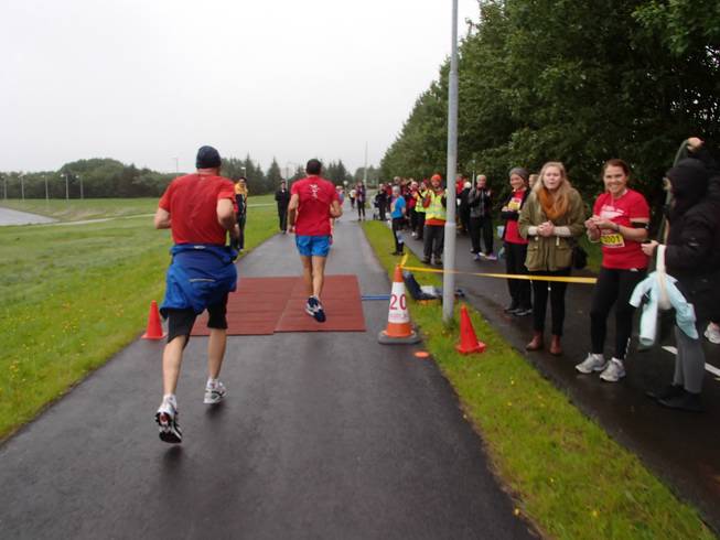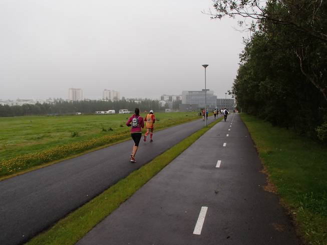 Sundagarđar 10.01 Uhr / Km 15,0 Nun kam eine etwas längere Steigung. Bis dahin war der Kurs ab Km 1 praktisch flach gewesen. |