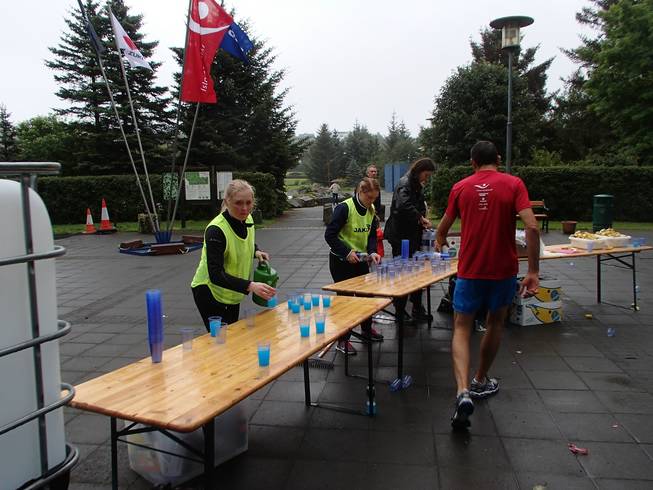 Engjavegur / Laugardalur 10.36 Uhr / Km 21,2 Die zweite Hälfte meines 100. Marathon begann mit einem Verpflegungsstand. Die Dame hier vorne guckte so, als wolle ich mit meinem Kostüm in Island die Monarchie einführen. |