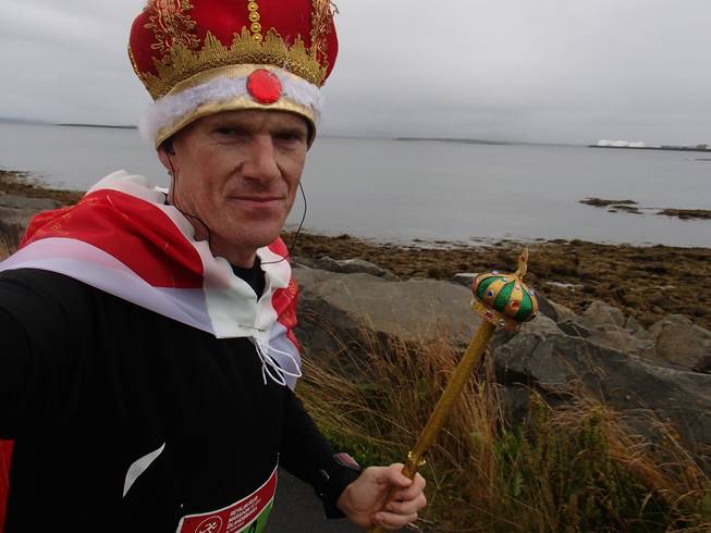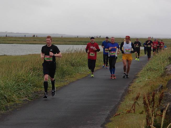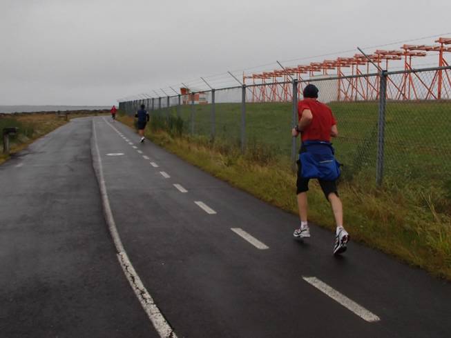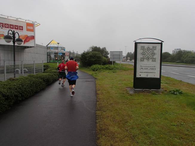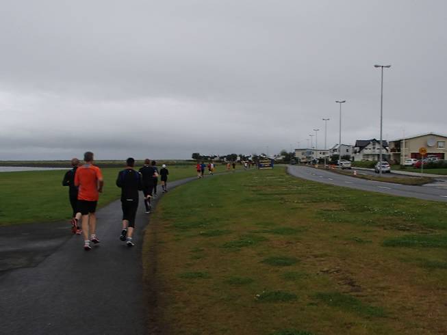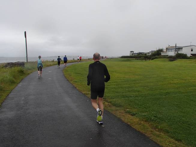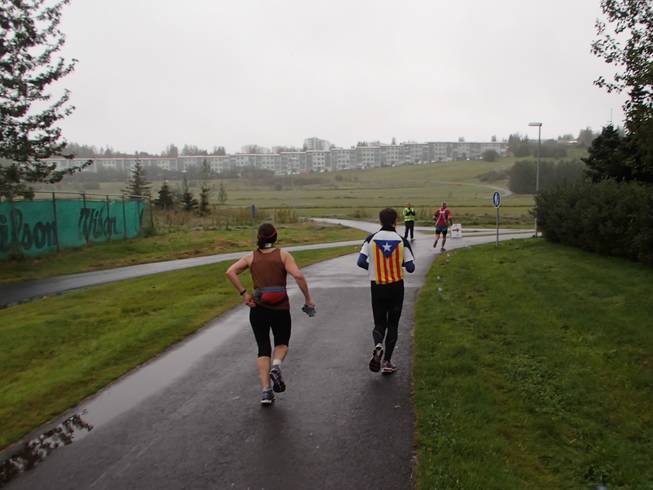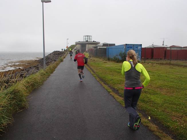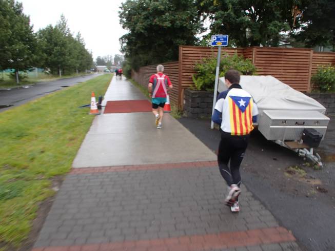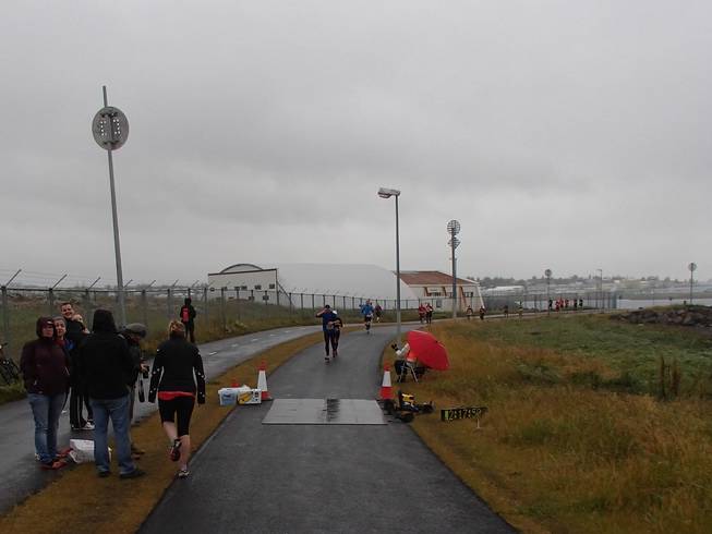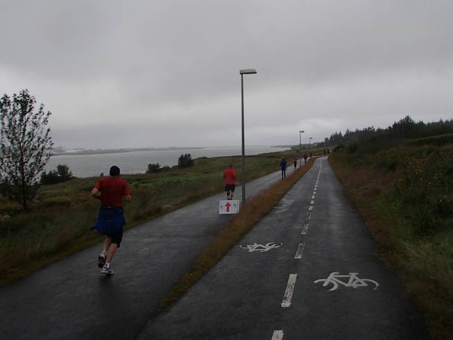Skildinganes 11.35 Uhr / Km 31,5 Der Wind von der Seite spielte unablässig mit meinem Banner, aber so lange ich weite Bögen um die Mitläufer machte, störte das nicht weiter. |