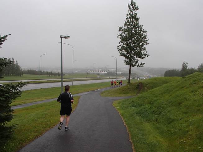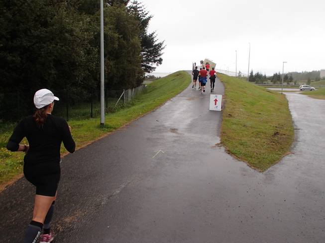 Fossvogur 11.10 Uhr / Km 27,4 Vielleicht sollte ich mit den Reykjavík-Marathon noch einmal bei besserem Wetter ansehen. Irgendwann. Die Bucht voraus sieht bei Sonne bestimmt deutlich besser aus als in diesem dunklen Regenwolkengrau. |