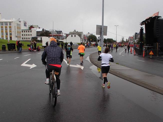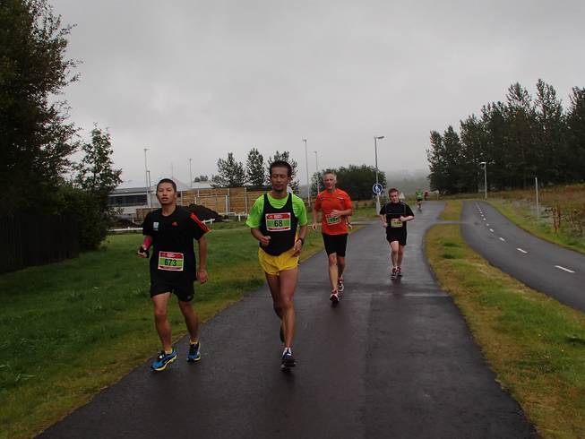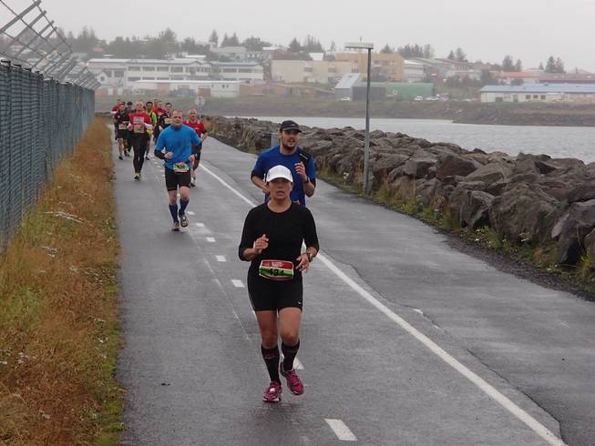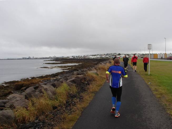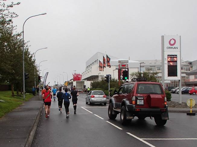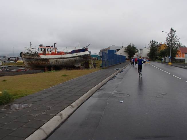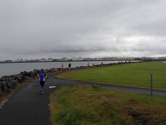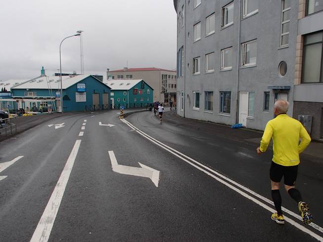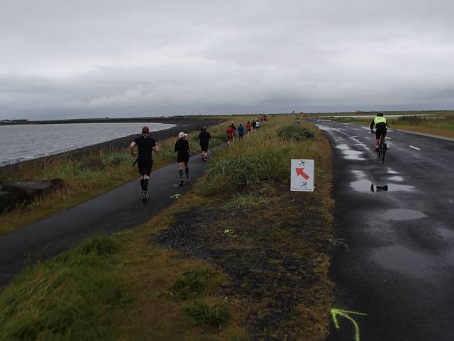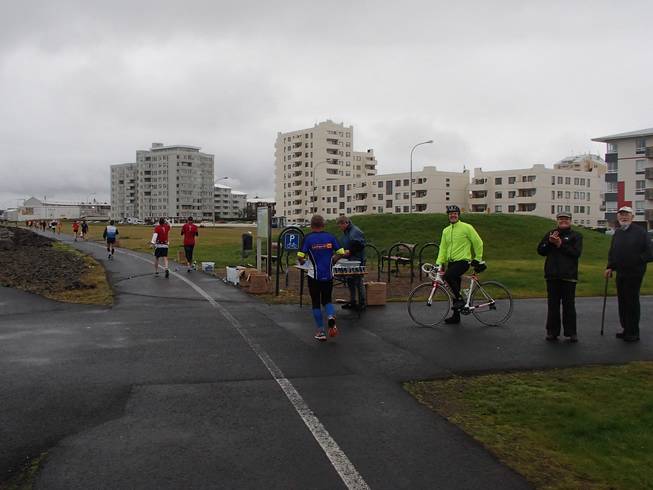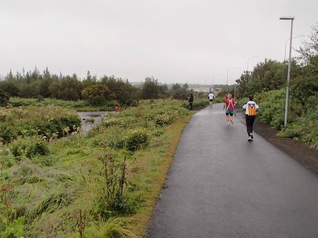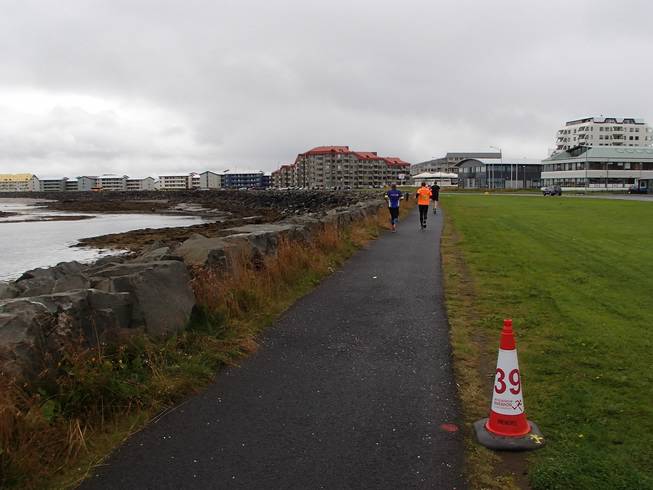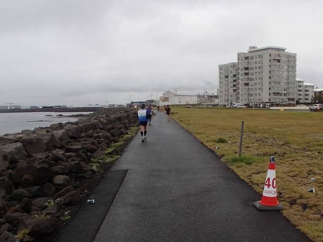 Norđurströnd 12.14 Uhr / Km 38,6 Die Strecke hier kannten wir ja schon von der ersten Hälfte. Psychologisch war es nun hilfreich, daß hier in Runde 2 die Schleife kürz vor der Innenstadt nicht mehr zu laufen war und man somit dem Ziel näher war als in Runde 1. :-) |
