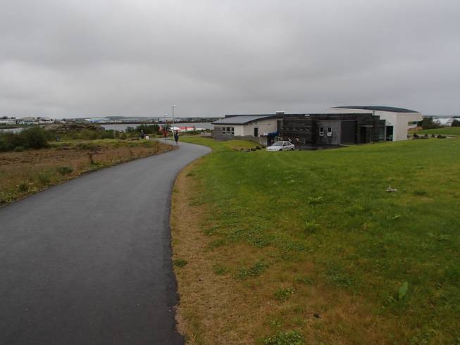 Fossvogur / Háskólinn í Reykjavík 11.17 Uhr / Km 28,8 Die eigentliche Háskólinn, also die Universität, liegt etwas rechts vom Bild. Ob das Gebäude voraus da tatsächlich noch zugehört, weiß ich nicht so genau. |
