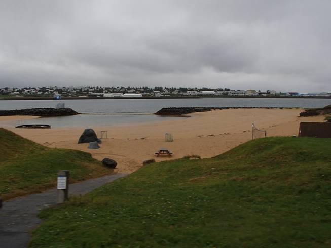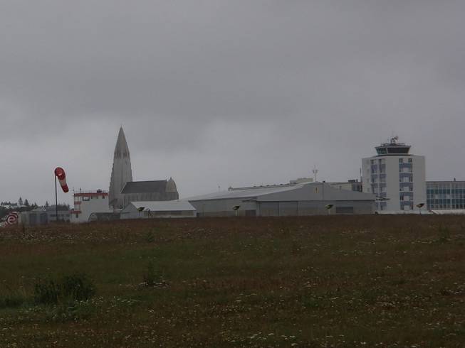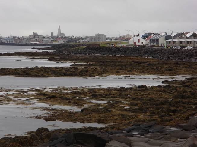 Fossvogur / Reykjavíkurflugvöllur 11.23 Uhr / Km 29,8 So konnte man von hier aus bis zur Hallgrímskirkja ins Stadtzentrum gucken. Da in Wurfweite lag auch das Ziel. |