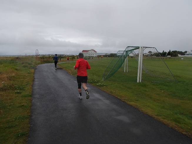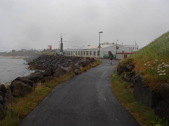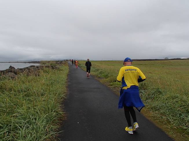 Hrólfsskálavör 11.51 Uhr / Km 34,5 So allmählich gingen die Kilometer dahin. Im Kopf hatte ich schon lange mit dem Countdown begonnen. Jetzt waren es nur noch 7,7 Kilometer bis ins Ziel. Ein wenig mehr als einmal um die Außenalster zu Hause in Hamburg. |
