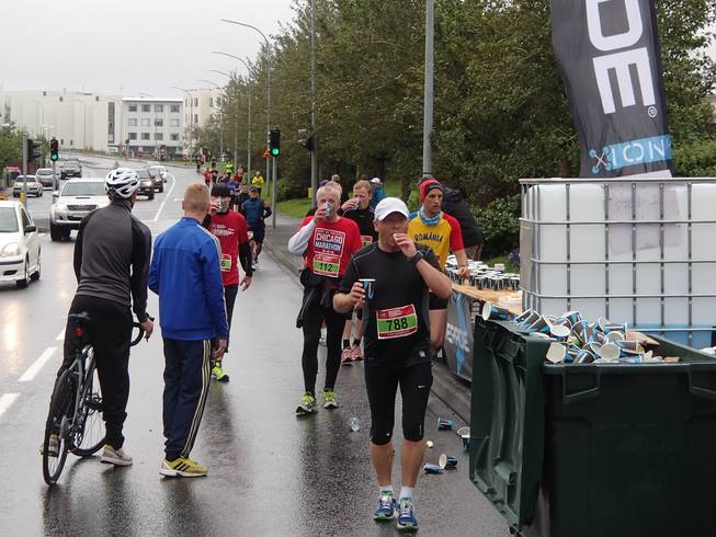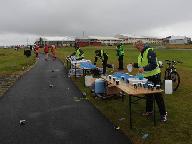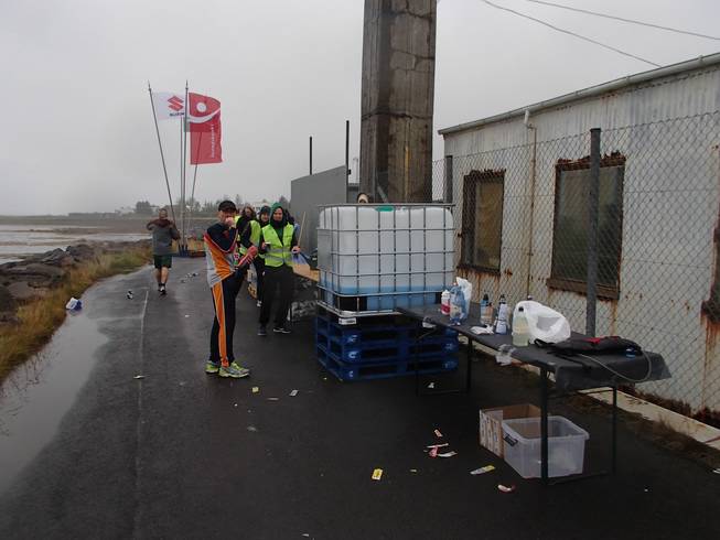 Eiđsgrandi 12.22 Uhr / Km 39,9 Und dann kam schon der letzte Verpflegungsstand. Naja, ein richtiger Stand war es nicht, aber es gab noch einmal zu trinken. |