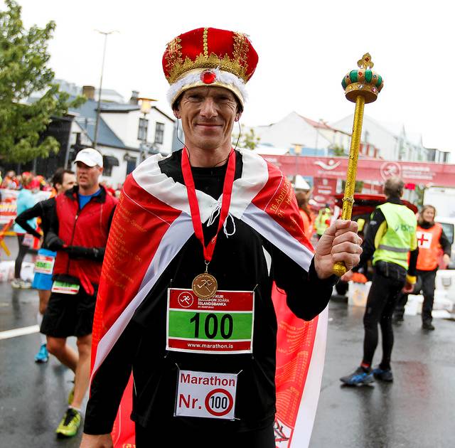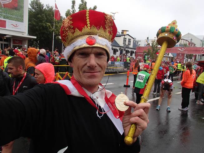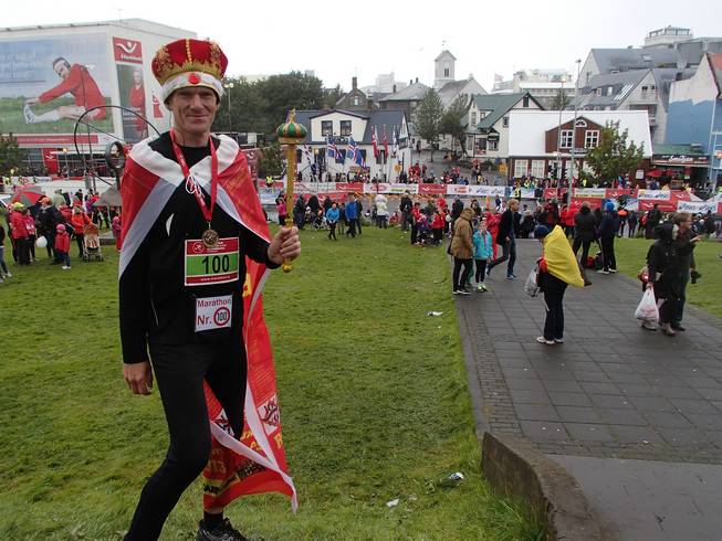 Lækjargata / Útitafliđ 12.51 Uhr Noch ein Foto mit Kostüm, welches den Lauf leidlich gut überstand. Vom Zepter hatte sich am Handgriff die Goldfarbe etwas gelöst (die Goldkrümel hatte ich noch Tage später überall in der Kleidung) und das Banner hatte auf dem Kurs reichlich Island aufgesammelt. Das ließ sich aber problemlos heraus waschen. |