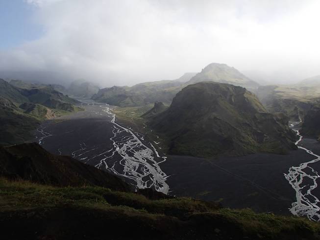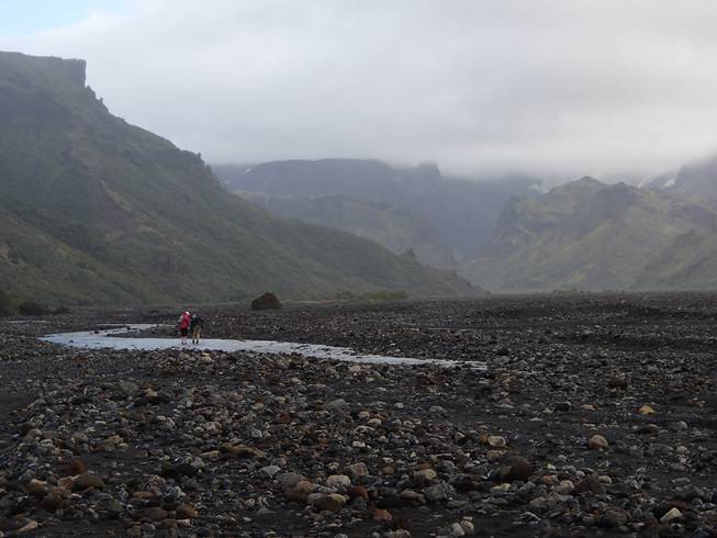 Abstieg Valahnúkur Stakkholtsgjá und die Krossá. Am linken Rand des Bildes jenseits der Flusses liegt Básar, das Etappenziel. |