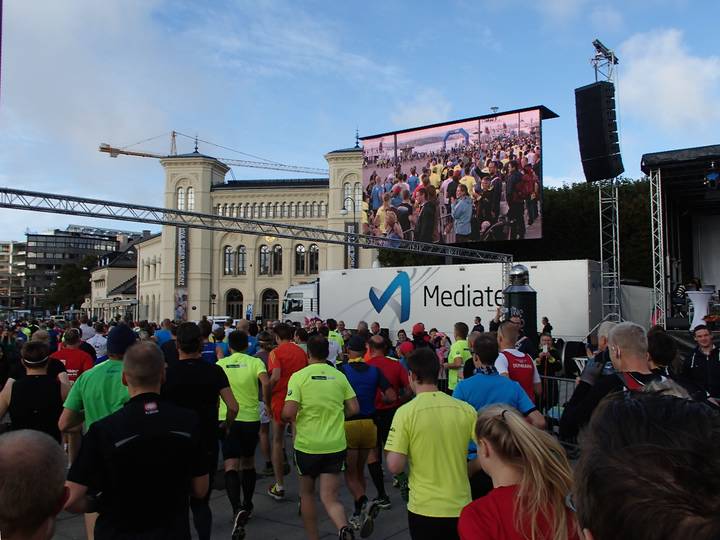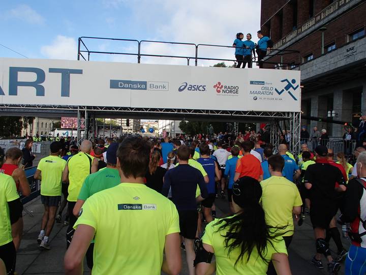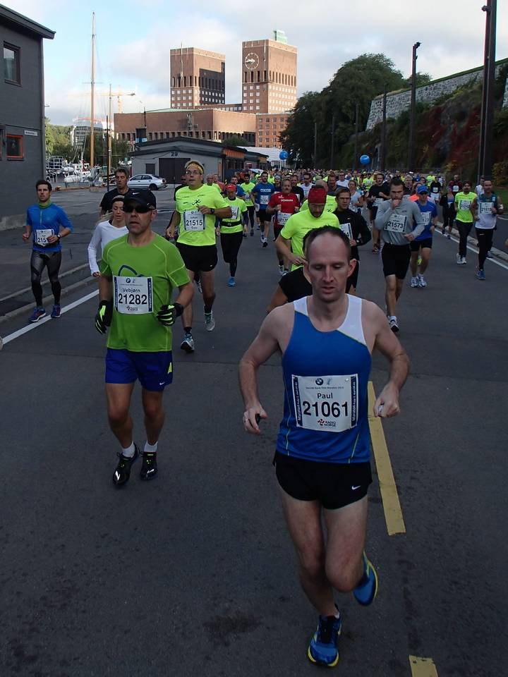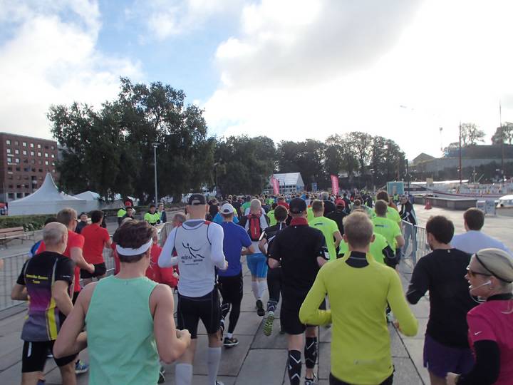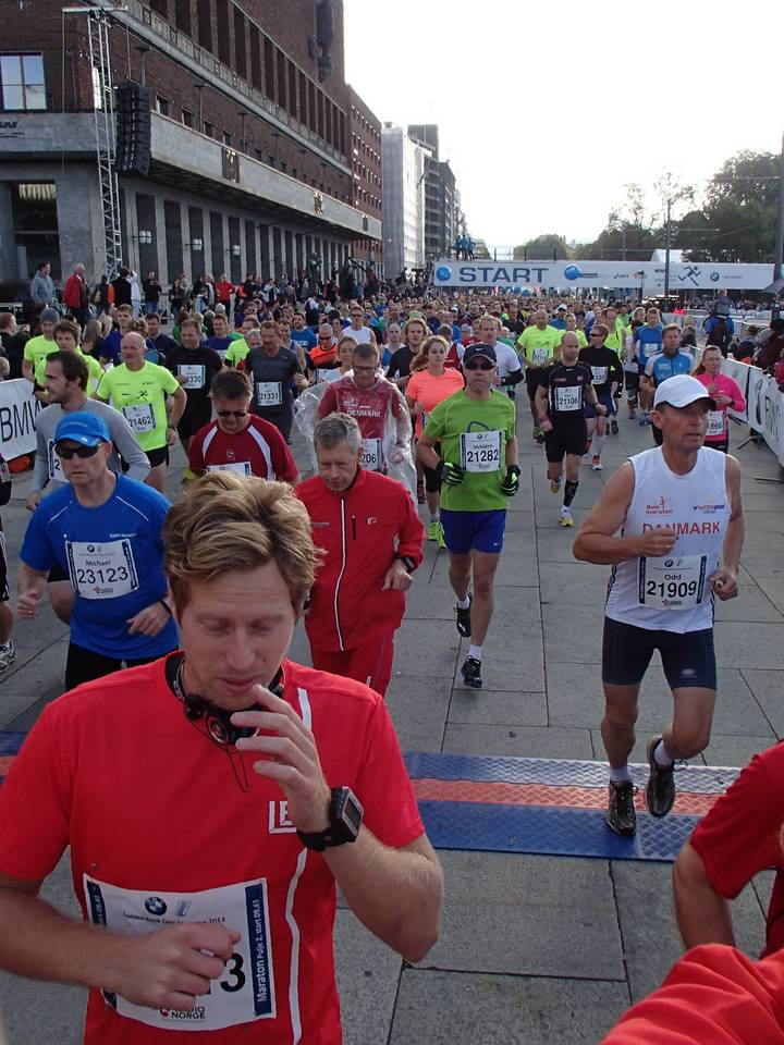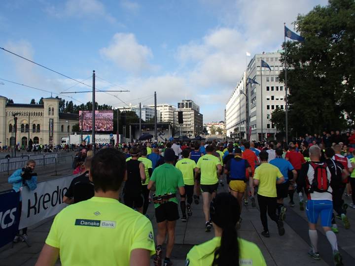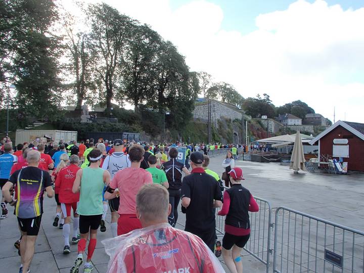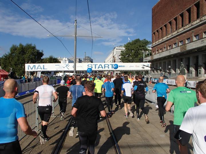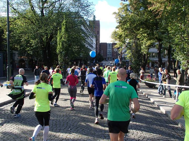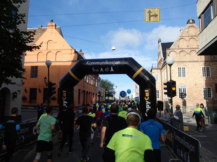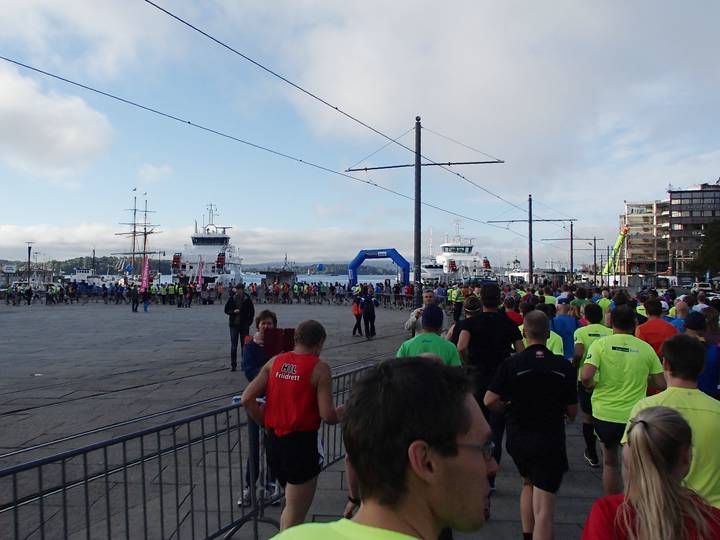 Rådhusplassen 9.43 Uhr / Km 0,02 Knapp 1000 Läufer gingen mit mir in der zweiten von drei Startgruppen auf die Strecke. |