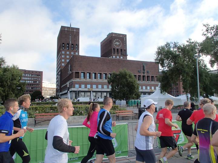 Rådhusplassen 9.43 Uhr / Km 0,1 Los ging es mit einer lang-gezogenen Linkskurve über den Rathausplatz. |