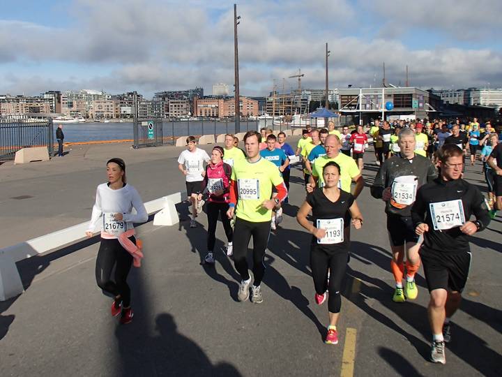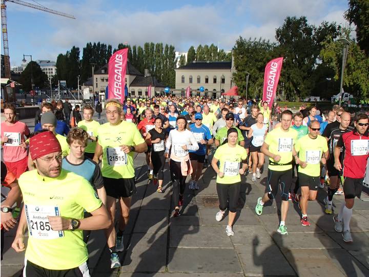 Rådhusplassen 9.43 Uhr / Km 0,0 Und los ging es. Auf vier Schleifen, von denen drei recht ähnlich waren. Aber zunächst kam eine 10 Kilometer lange Schleife, die dem späteren 10 Km-Lauf "10 for Grete (Waitz)" entsprach. Der Lauf ist der leider 2011 verstorbenen norwegischen Läuferin Grete Waitz gewidmet, Marathon-Weltmeisterin, Weltrekordlerin und NEUN-malige Siegerin beim New-York-Marathon. |