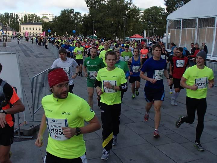 Akershusstranda 9.46 Uhr / Km 0,5 Wenn man den Blick einen Moment vom in der Sonne thronenden Osloer Rathaus abwenden kann, erkennt man im Feld die beiden Ballons der 3:45-Stunden-Zeitläufer. Und rechts die Mauer der Akershus Festning (die Festung von Akershus). |