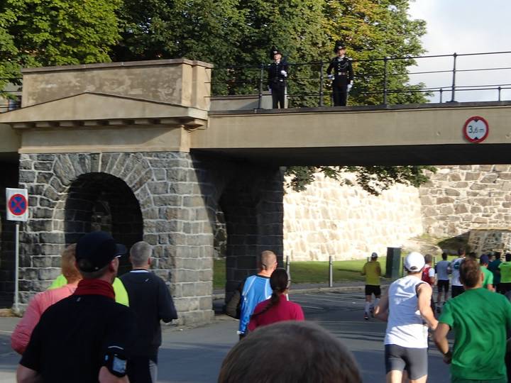Kongens gate 9.50 Uhr / Km 1,4 Die Festungswache war auch angetreten. Die verzogen aber keine Miene. |