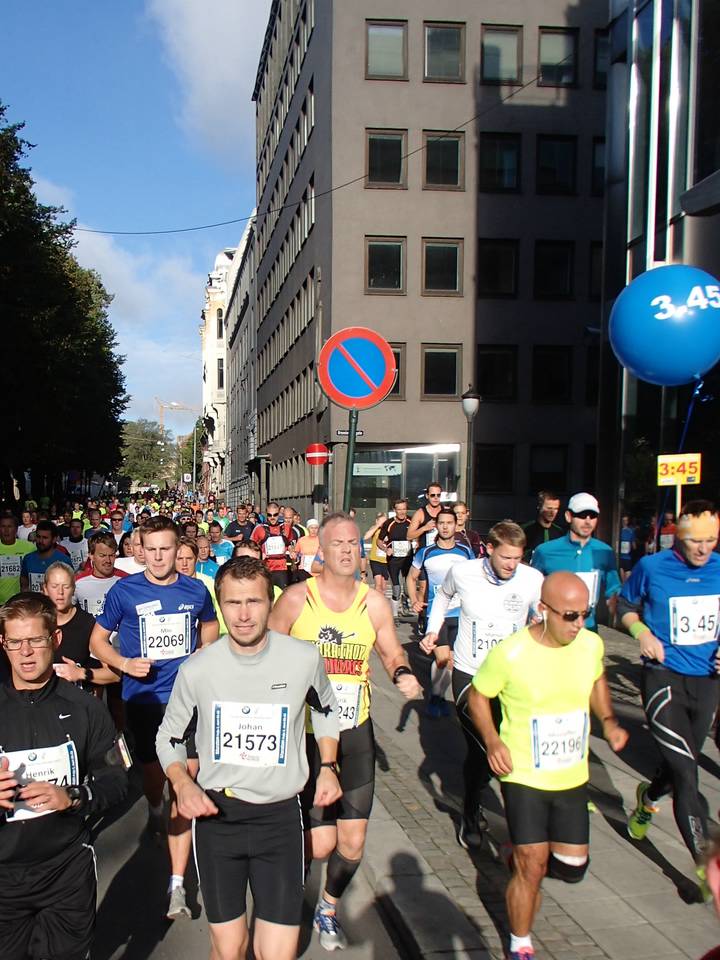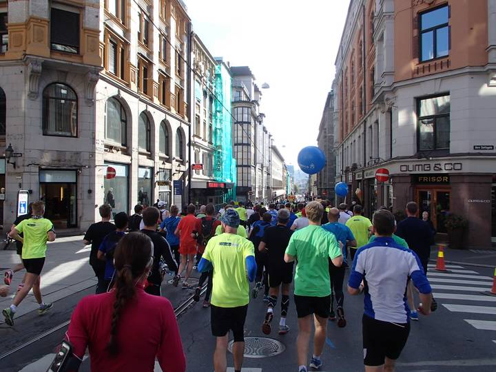 Rådhusgata 10.24 Uhr / Km 7,7 Im Viertel Quadraturen auf dem Weg in Stadtzentrum hing ich immer noch in Sichtweite der 3:45-Stunden-Ballons. Erstaunlich... |