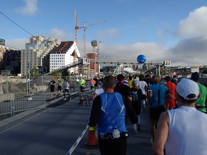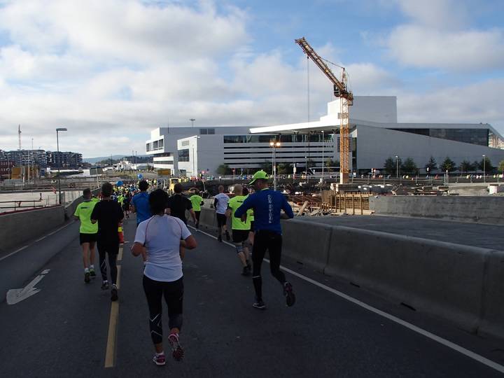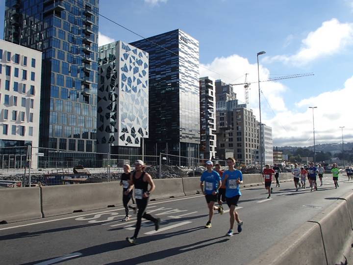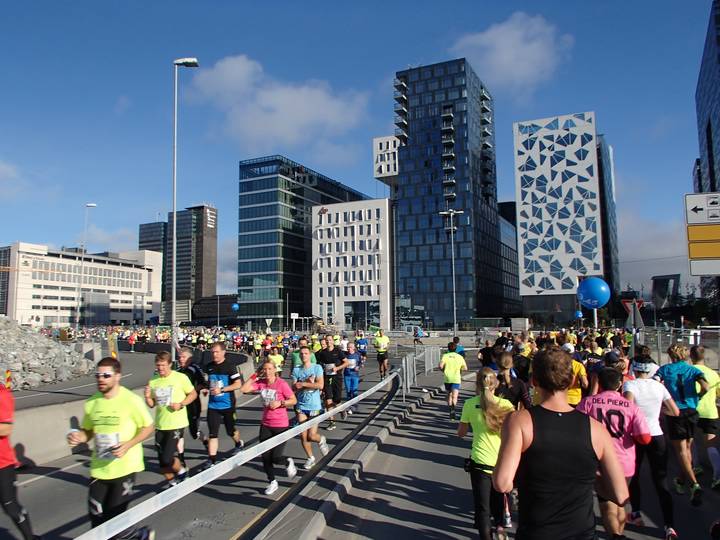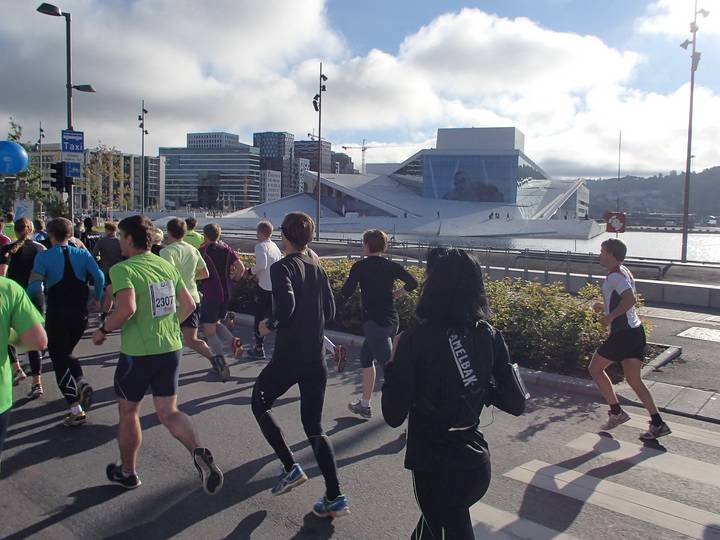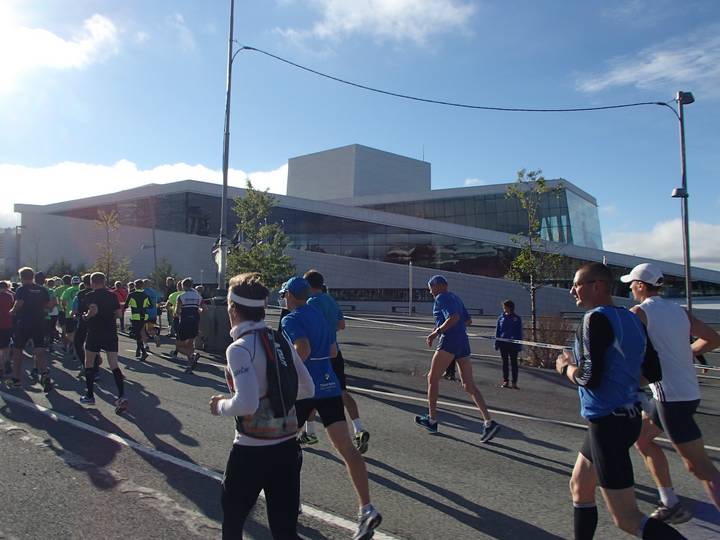 Operagata 9.57 Uhr / Km 2,6 Immer noch das Operahuset im Hintergrund. Ich hatte nicht die Idee, in dieser Zeitklasse zu laufen. Die Tage davor waren mit einem strammen Programm von Norwegen- und Oslo-Sightseeing gefüllt gewesen. Da wollte ich den Marathon eher ruhig angehen. |