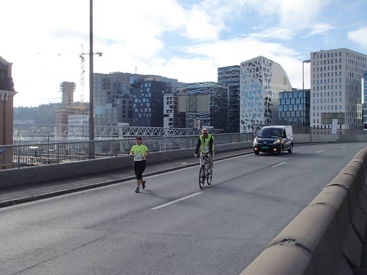 Nylandsveien 10.04 Uhr / Km 4,0 Hinter dem Hauptbahnhof ging es per Brücke über die Schienen. So kommen die ersten Höhenmeter in die Strecke. |
