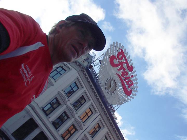 Karl Johans gate 10.28 Uhr / Km 8,4 Hier findet sich auch die bekannte Leuchtreklame vom Schokoladenhersteller Freia. Die hängt da schon seit 1909. Naja, wohl nicht genau die, aber irgendeine der Firma. |