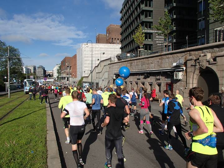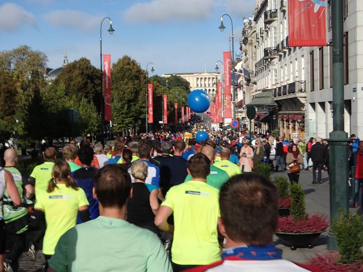 Rådhusgata 10.36 Uhr / Km 9,9 Die 3:45-Stunden-Ballons hatte ich immer noch in Sichtweite. Immer nach den Verpflegungsständen kam ich ihnen sehr nahe. Das ist ungewöhnlich. Die meisten Ballon-Läufer sind an den Verpflegungsständen viel schneller als ich. |
