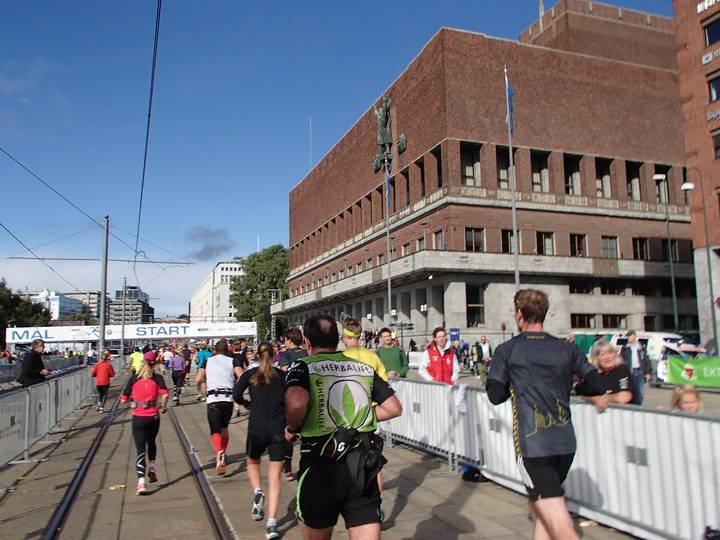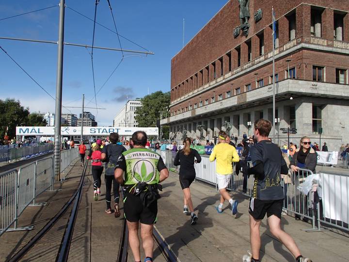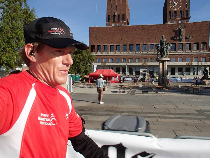 Rådhusplassen 10.38 Uhr / Km 10,2 Mit schönem Blick auf das Rathaus ging es weiter. So schnell konnte man kaum Fotos machen, wie man eigentlich sollte. |