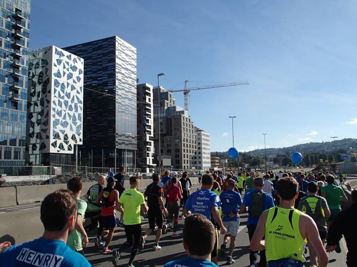 Operagata 10.50 Uhr / Km 12,6 Wieder ging es durch das Neubaugebiert. Ich war beim normalen Oslo-Sightseeing nochmals am Montag in dieser Gegend und da war es mächtig laut. |