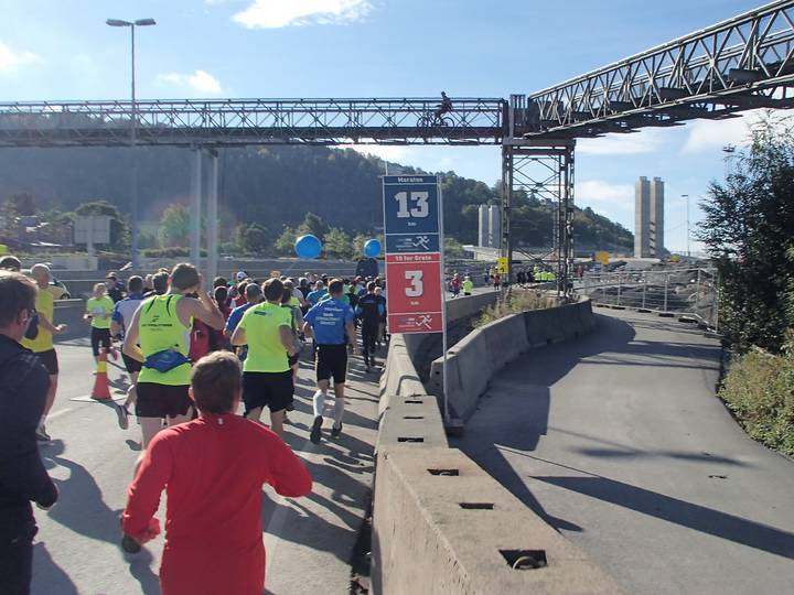 Nylandsveien 11.16 Uhr / Km 17,4 Ich begann damit, den Pulk um die 3:45-Stunden-Ballon-Läufer zu überholen. Gar nicht so einfach. Aber ich kam noch vor der Beton-Mauer vorne wieder nach links, ohne jemanden zu behindern. |