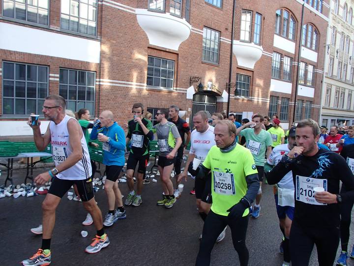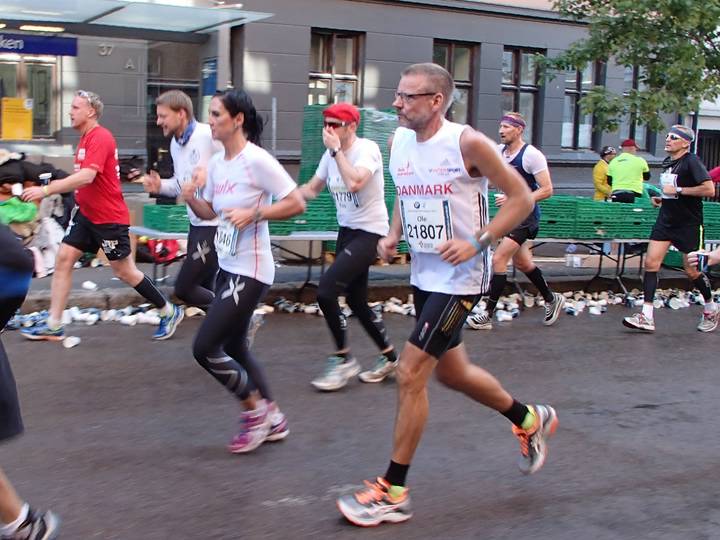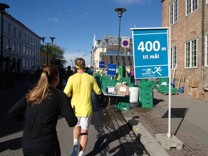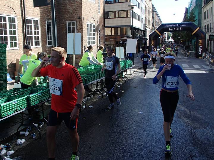 Tøyengata 11.04 Uhr / Km 15,1 Und nun gab es erst einmal Erfrischung. Das war der erste Verpflegungsstand seit Km 9,5. Das war schon ein ziemliches Loch. Bei 13 Ständen insgesamt ist der durchschnittliche Abstand drei Kilometer. |