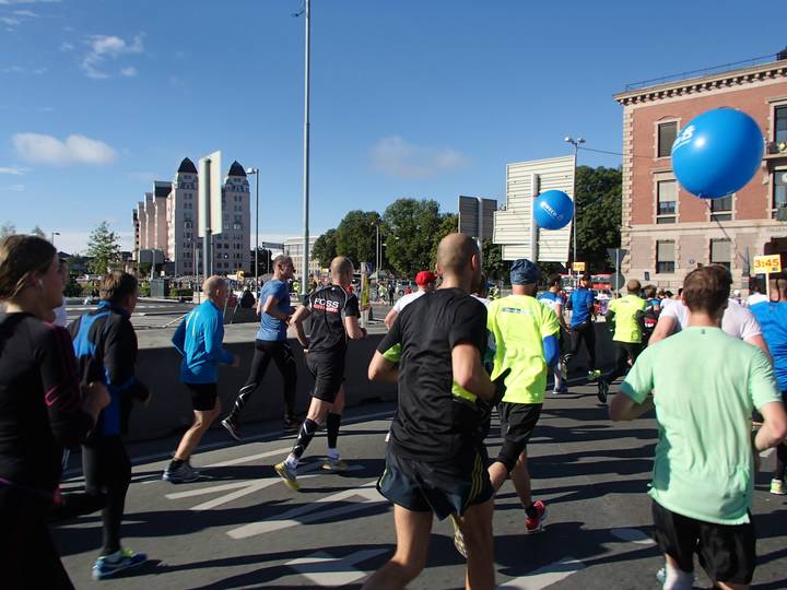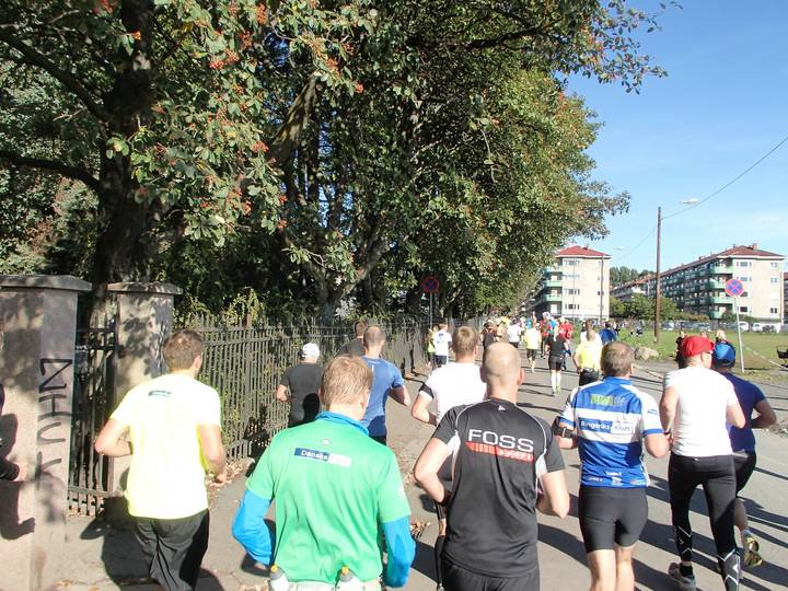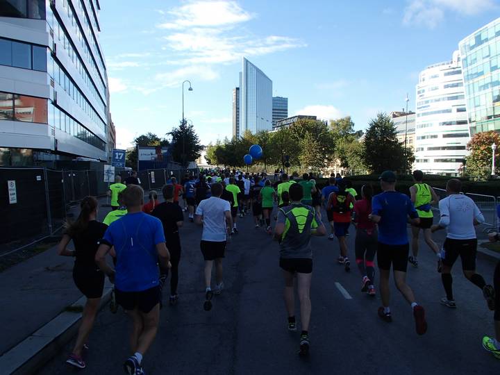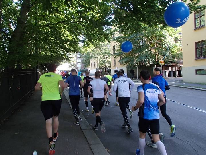 Rubina Ranas gate 11.01 Uhr / Km 14,7 Immer noch hielt ich das recht flotte Tempo hinter den 3:45-Stunden-Ballon-Läufern durch. Dabei ist so ein Laufen in der Gruppe sonst so gar nicht mein Ding. In Oslo passierte es daher auch mehr zufällig als von mir gewollt. |