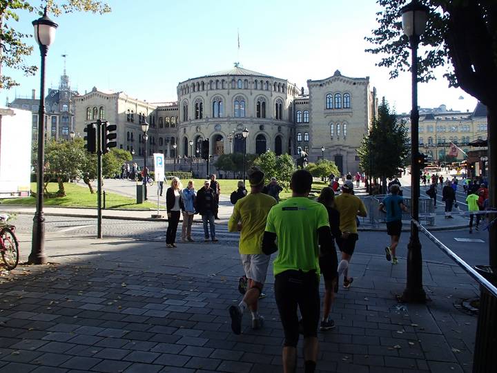 Spikersuppa / Stortingsgata / Eidsvolls plass 11.29 Uhr / Km 20,1 Wieder das Norwegische Parlament. Und auch hier erstaunlich wenig Sicher-heitsleute unterwegs. Man fühlt sich hier wohl immer noch sicher. |