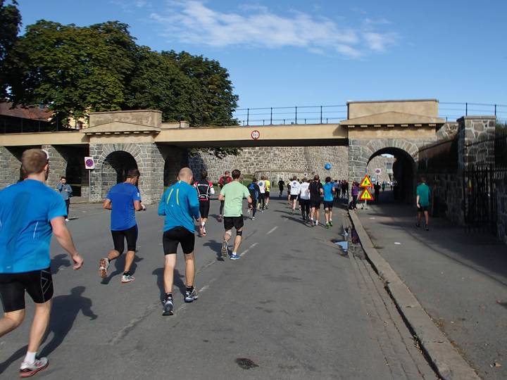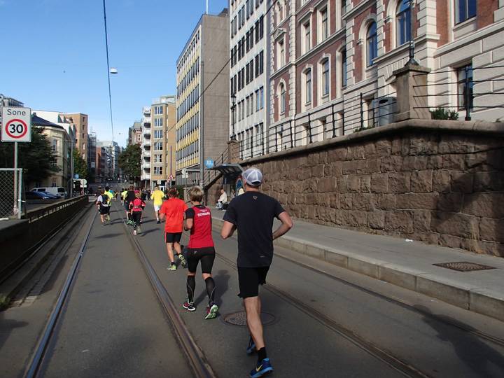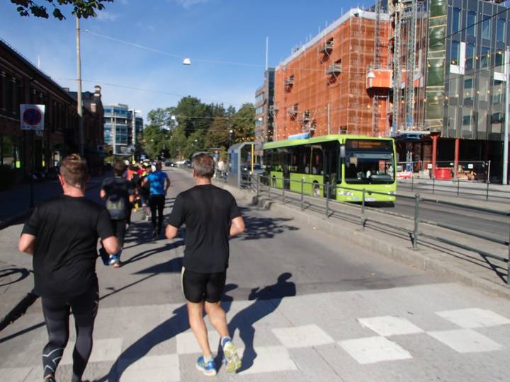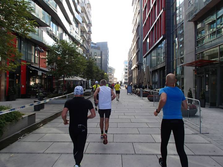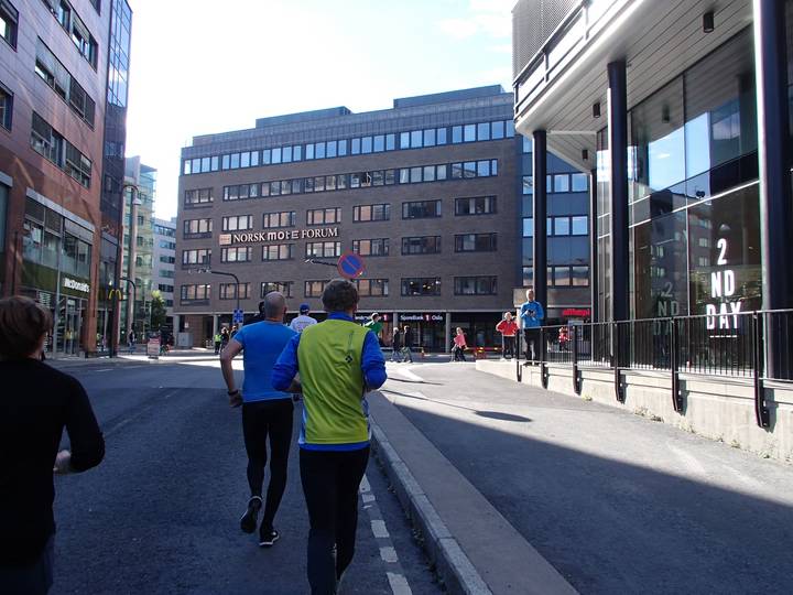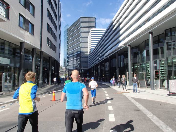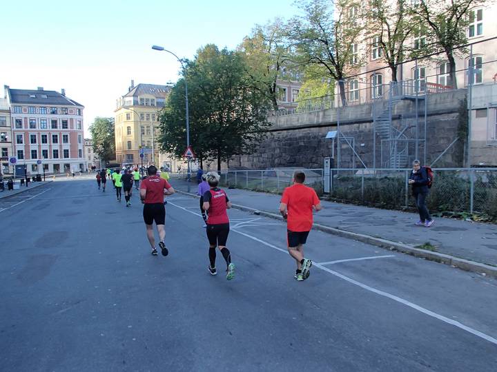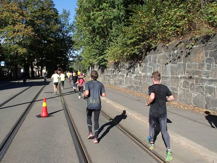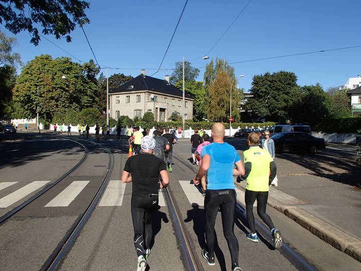 Ruseløkkveien 11.38 Uhr / Km 21,6 Diese dritte Schleife würde später der Anfang vom Halbmarathonkurs seiu. Die Marathonläufer haben eben keinen eigenen Kurs, sondern laufen nur nach und nach die Kurse der anderen Läufe ab. :-) |