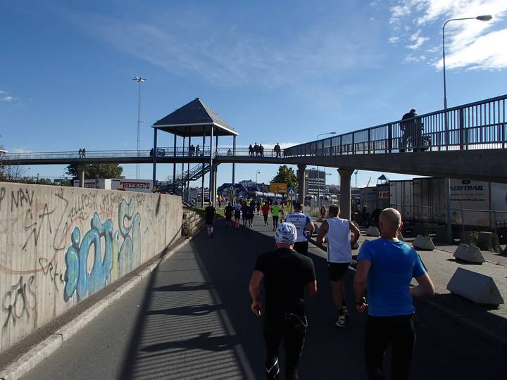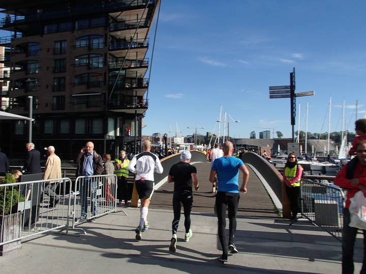 Frognerstranda 12.07 Uhr / Km 27,1 Nun kam der Abschnitt, den ich schon am Vortag beim Trainingslauf unter die Füße genommen hatte. Da kam ich von vorne aus der Stadt und lief dann hier über die Brücke. Diesmal ging es unten drunter. |