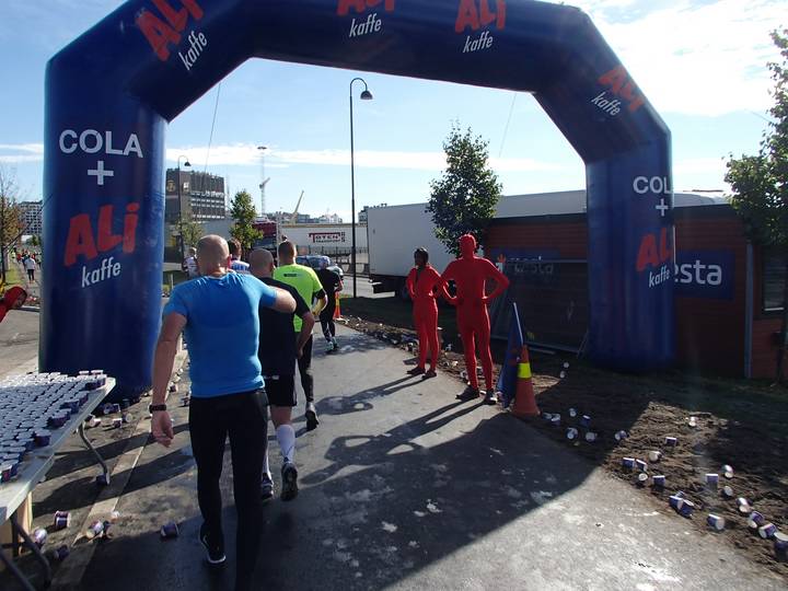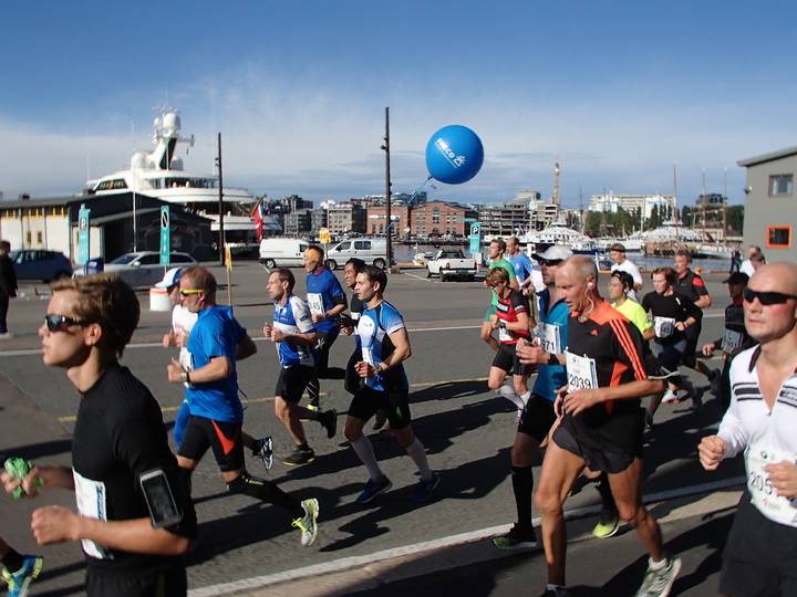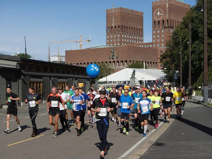 Akershusstranda 12.19 Uhr / Km 29,2 Während ich meine Sachen noch ordnete, zogen die blauen Ballons langsam an mir vorbei. Gut so, also mußte ich das Überholen der immer noch kompakten Gruppe nicht auf der Strecke über ich ergehen lassen. |