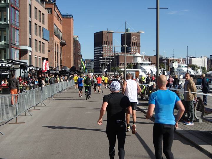 Stranden / Aker Brygge 12.14 Uhr / Km 28,4 Eigentlich zu schön um wahr zu sein. Der Lauf über die Aker Brygge auf das Osloer Rathaus (die beiden roten Türme) zu. |