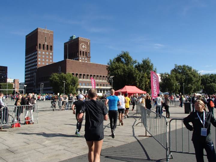 Rådhusplassen 11.36 Uhr / Km 21,3 Statt der schönen Runde auf dem Rathausplatz ging es nun geradeaus in den Westen von Oslo. |