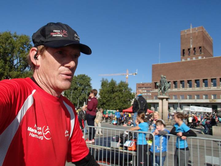 Rådhusplassen 12.17 Uhr / Km 28,8 Noch 13,4 Kilometer und dann wäre da vor dem Rathaus das Ziel und es gäbe die Medaille. |