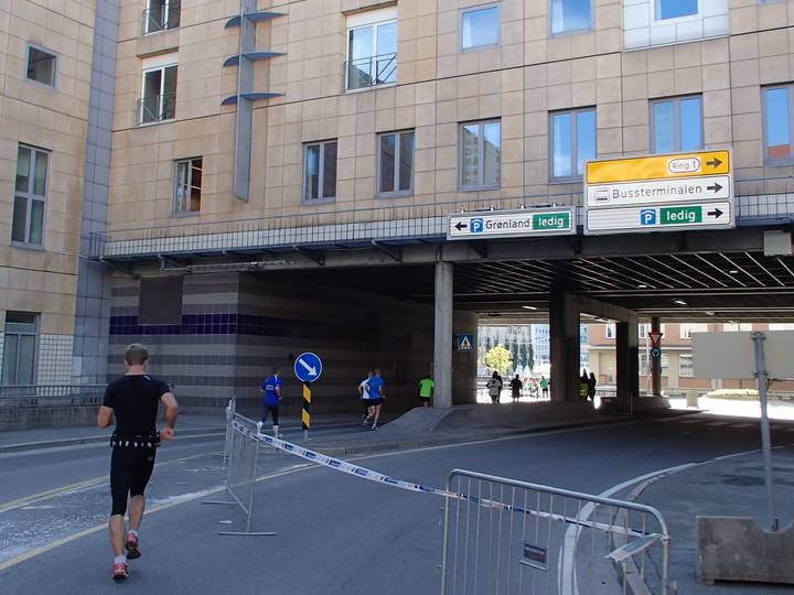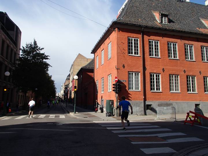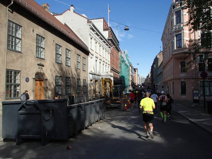 Kongens gate 12.25 Uhr / Km 30,3 Das Mehr an Kilometern auf dieser vierten Schleife wurde mit drei Änderungen gegenüber der ersten Schleife erreicht. Zunächst lief man hier im Viertel Quadraturen noch einen Block extra ab. Das brachte wohl schon so um die 500 Meter ein. |