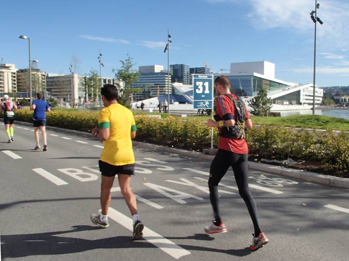 Langkaia 12.29 Uhr / Km 30,9 Im Hintergrund wieder das Operahuset, wobei ich mich bei jedem Anblick mehr ärgerte, den Trainingslauf am Vortag nicht auch noch dorthin verlängert zu haben. Da einmal drüber laufen wäre doch kultig gewesen.