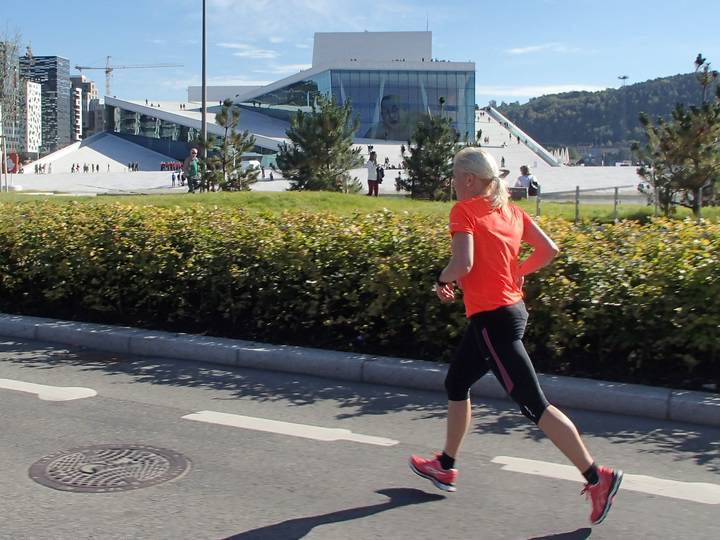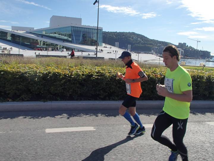Nylandsveien 13.13 Uhr / Km 38,8 Diese Silhouette kannte ich doch. Und dieses Mal meine ich nicht das Operahuset im Hintergrund. Nachdem sie mich während meiner Pinkelpause bei Km 29 überholt hatte, zog nun ich wieder vorbei. |