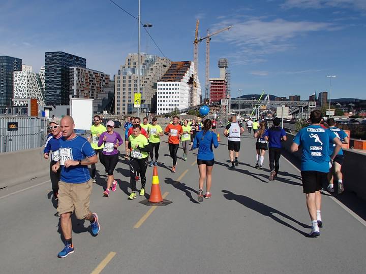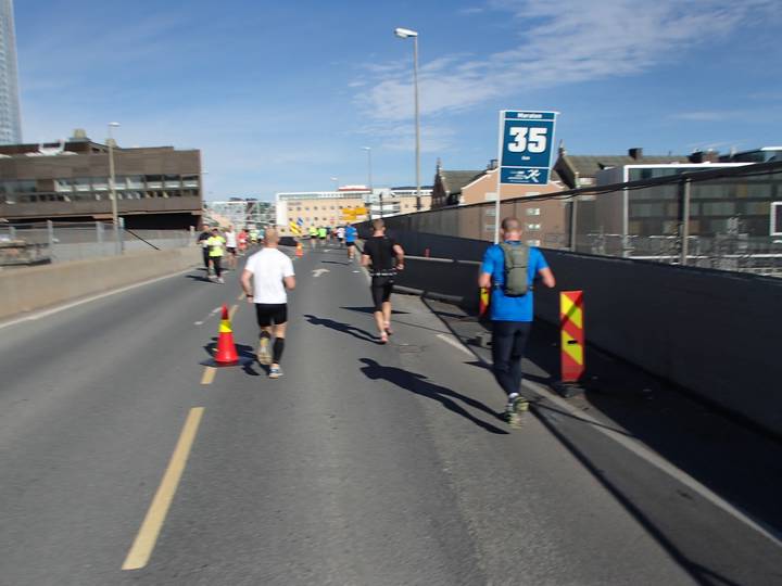 Bispekaia 12.33 Uhr / Km 31,8 Und als wir uns so auf den Weg auf die Runde am Bispeviken machten, kamen und auch schon die 3:30-Stunden-Ballon-Läufer entgegen. Die hatten so um die 2,5 Kilometer Vorsprung. |