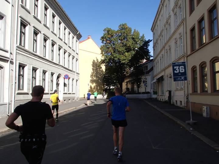 Platous gate 12.57 Uhr / Km 36,0 Naja, so ungefähr konnte man den Rest der Strecke zusammenfassen. Zuvor kam aber erst noch Km 36 und damit waren es noch 6,2 Km ins Ziel. Die Fenster-Fans von den ersten beiden Schleifen (links hinter dem Schild Halteverbot) waren leider nicht mehr da. |
