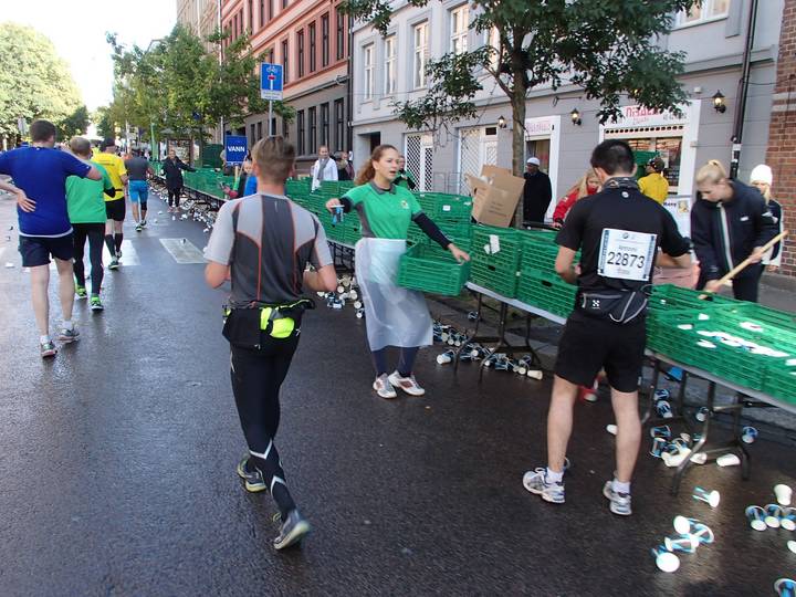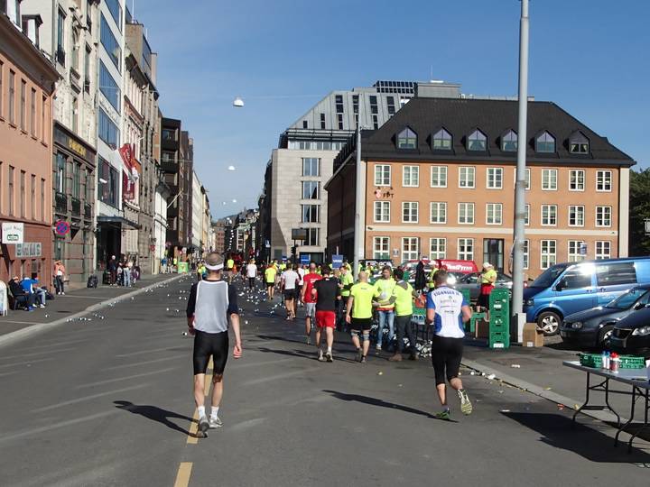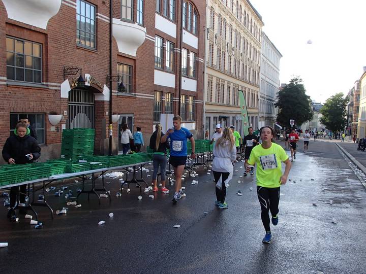 Tøyengata 12.59 Uhr / Km 36,4 Uff... endlich. Der erste Verpflegungsstand seit Kilometer 30,5. Gerade gegen Ende des Rennens waren 5,8 Kilometer Pause schon krass. |