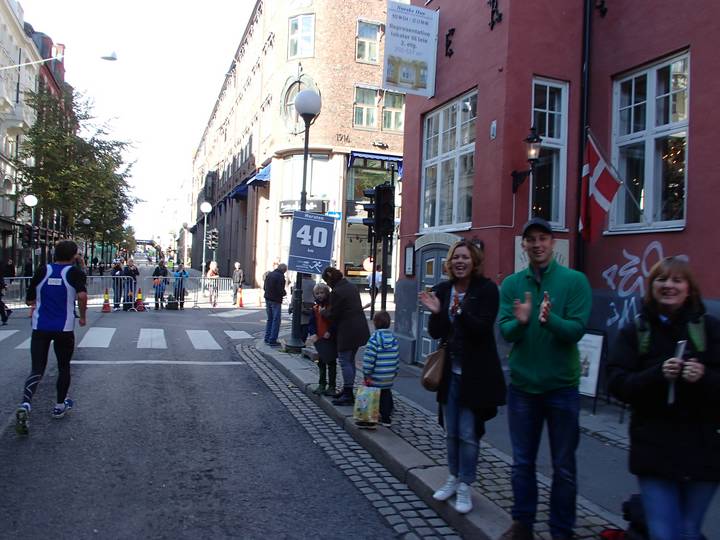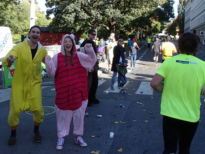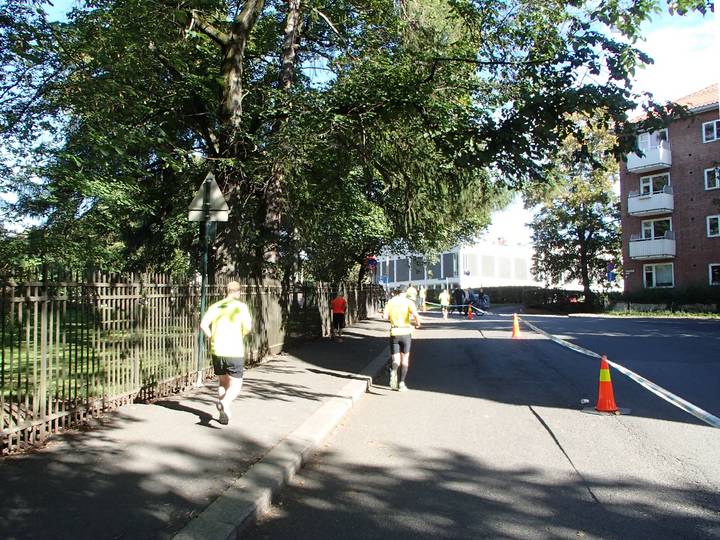 Tøyengata 13.00 Uhr / Km 36,5 Nette Verkleidung. Da kommt doch Freude auf. Wenige Freude kam auf als ich realisierte, daß wir wie in Schleife 2 auch diesmal um den Botanischen Garten herum laufen mußten. Das war dann die dritten Extra-Meter gegenüber der ersten Schleife, wo man hier noch nach links abbiegen durfte. |
