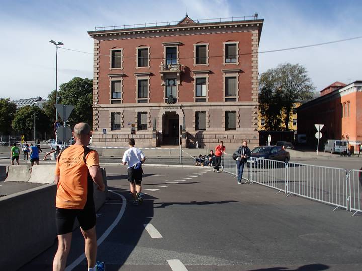 Rådhusgata 13.29 Uhr / Km 41,8 Das war aber nun wirklich die letzte Steigung. Einen Verpflegungsstand gab es am Christiania Torv nicht mehr. Ein Tisch mit ein paar Bechern Wasser stand aber noch da. |