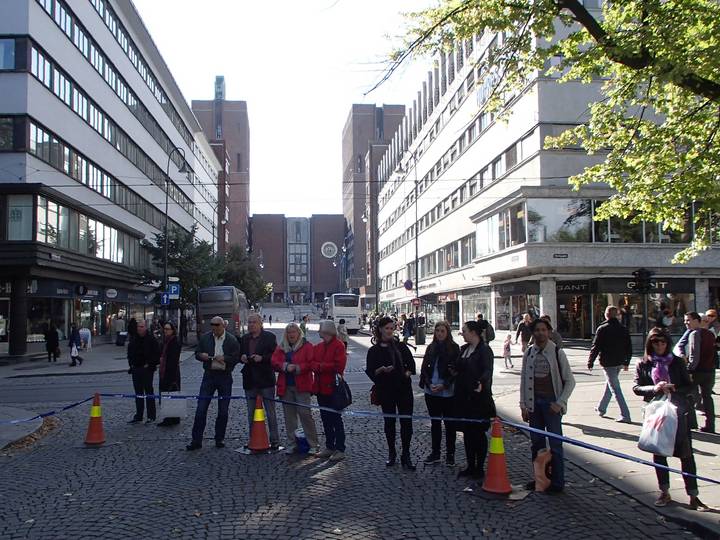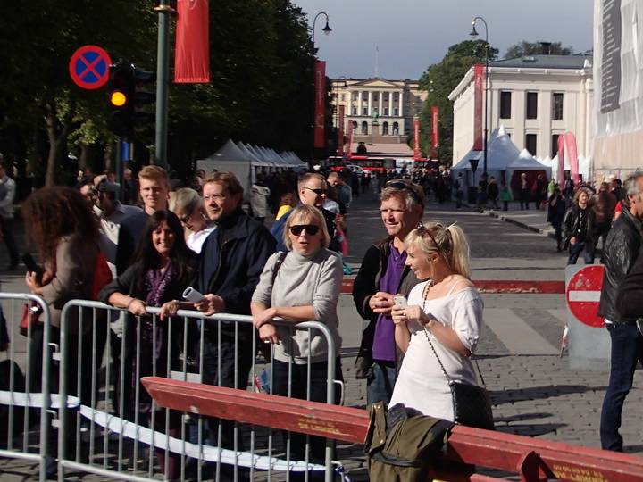 Karl Johans gate / Roald Amundsens gate 13.25 Uhr / Km 40,9 Keine Fahne, kein König? Ich hätte doch mal einen Blick in die Klatschpresse werfen sollen, wo sich die königlichen Hoheiten aufhielten. |