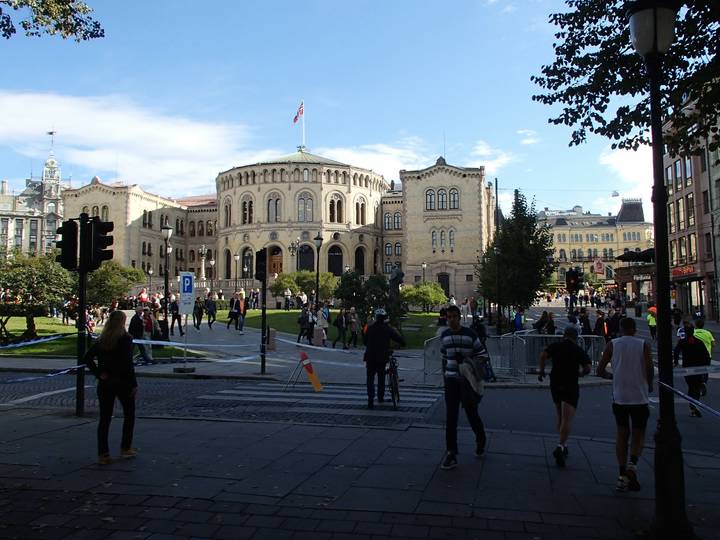 Karl Johans gate 13.23 Uhr / Km 40,7 Gleich links der Eidsvolls plass mit dem Stortinget und vorne voraus das Schloß. |