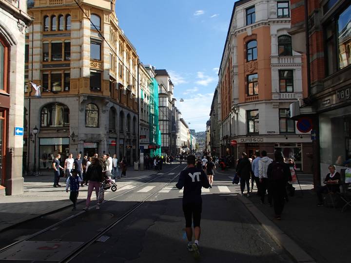 Kirkegata 13.21 Uhr / Km 40,1 Und noch eine Steigung. Hier im Zentrum hätte ich mit mehr Zuschauern gerechnet. Es war immerhin Samstag und alle Läden waren offen. |