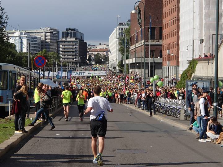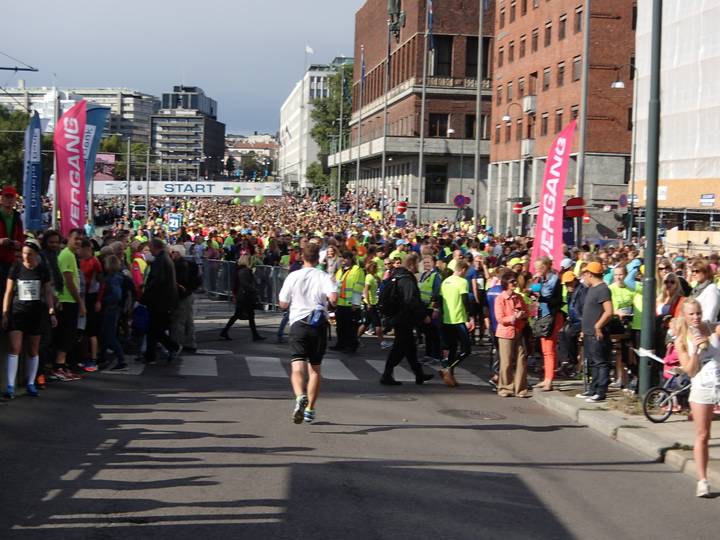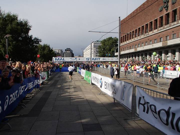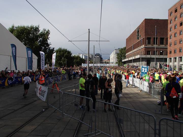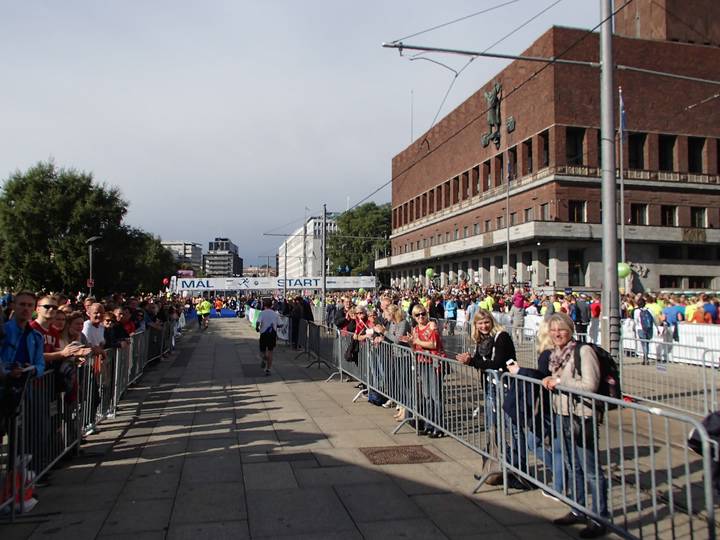 Rådhusgata 13.30 Uhr / Km 42,05 Einfach ins Ziel rollen lassen klang einfach. Aber da unten warteten gerade über 10000 Läufer auf ihren Start für den Halbmarathon. |