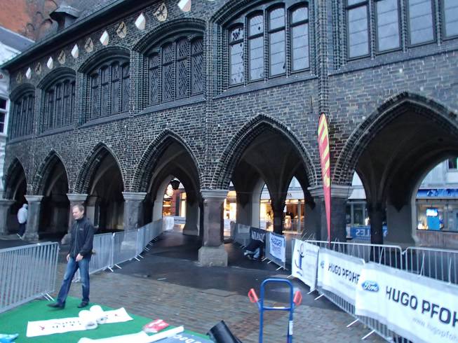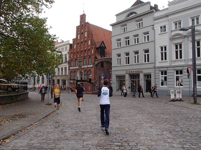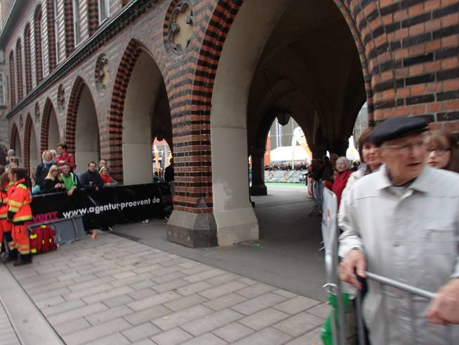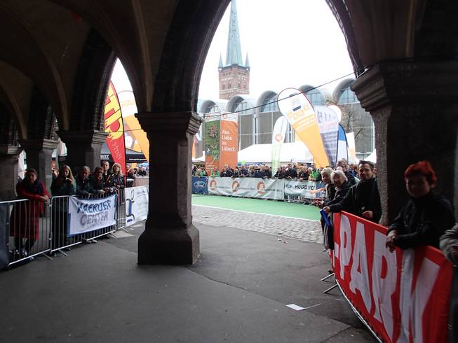 Markt, Lübeck 8.15 Uhr Zieleinlauf durch diese Arkaden. So viele Läufer auf einmal würden schon nicht kommen. Sonst wäre es etwas eng. Aber so kurz vor dem Ziel würde das schon kniffelig werden. |