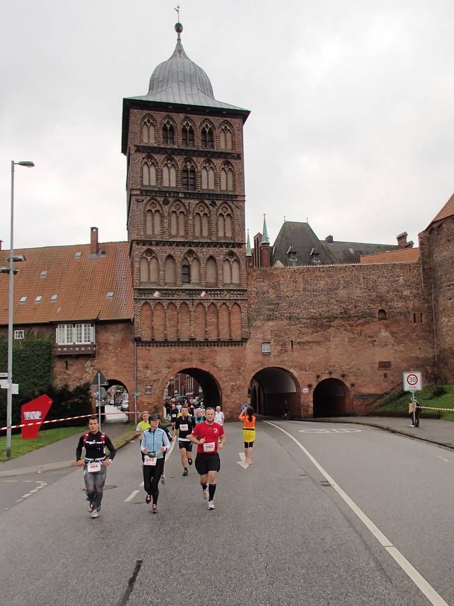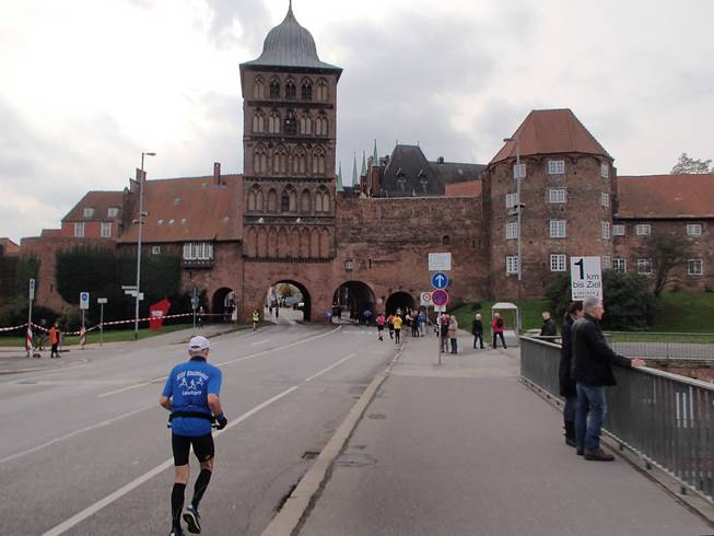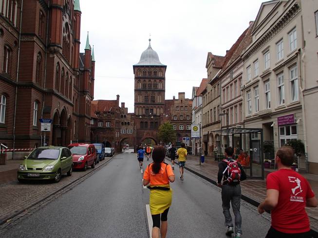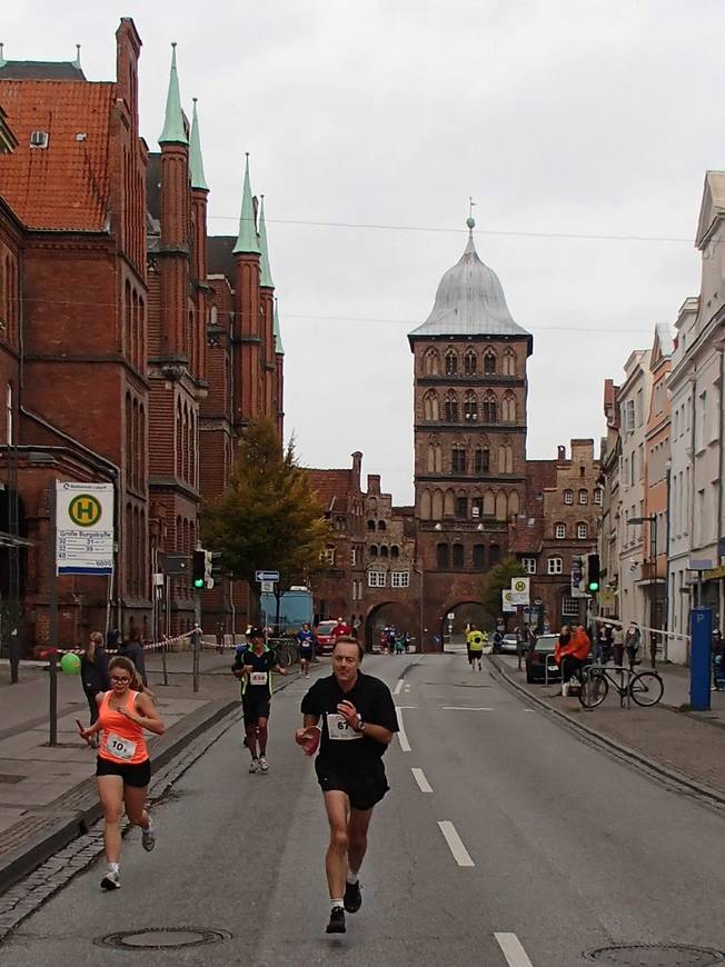 Holstenstraße 10.05 Uhr / Km 0,5 Gleich nach dem Start ging es durch das Stadtzentrum auf das Holstentor zu. |
