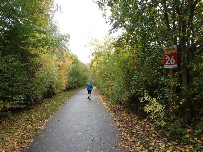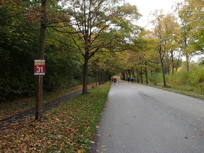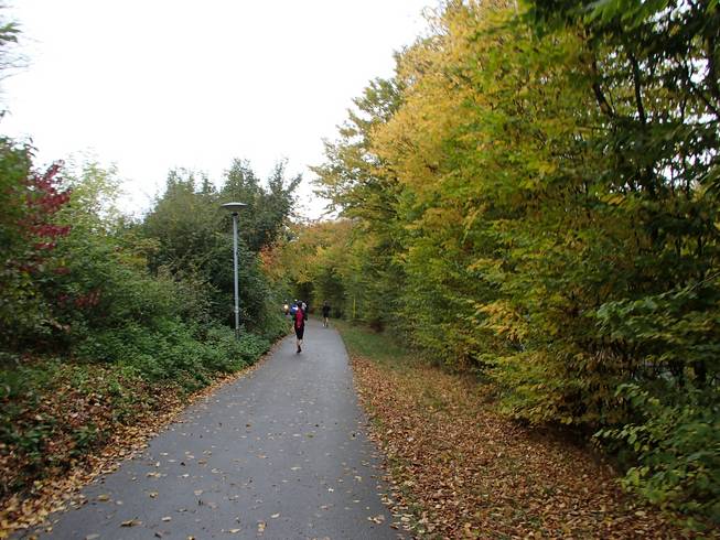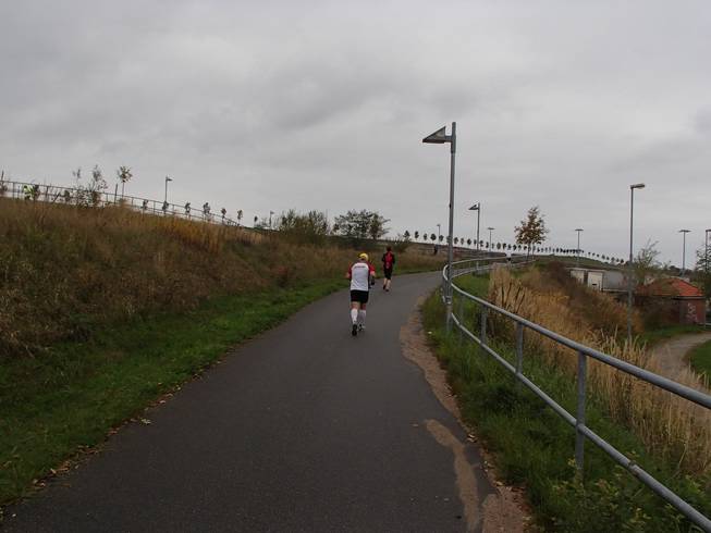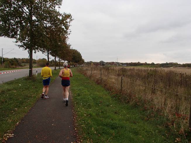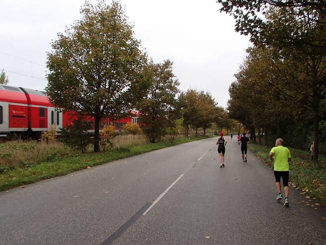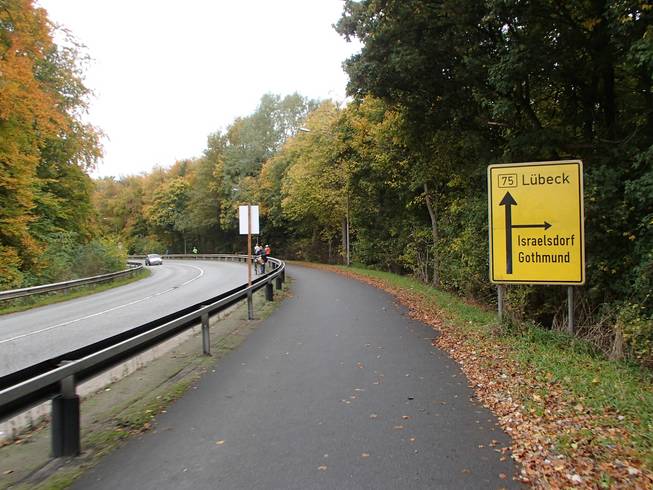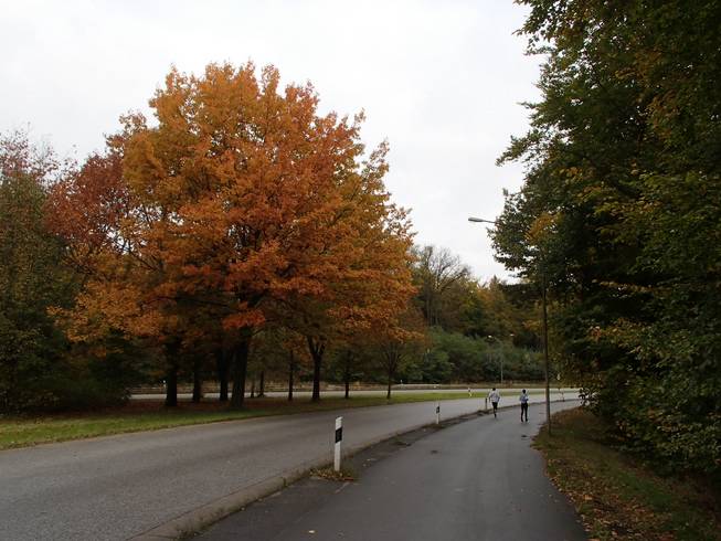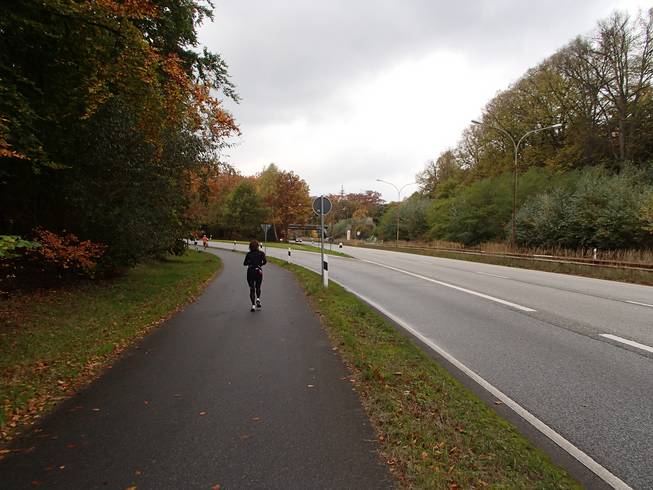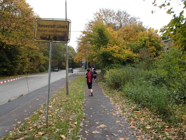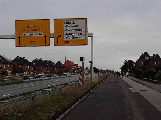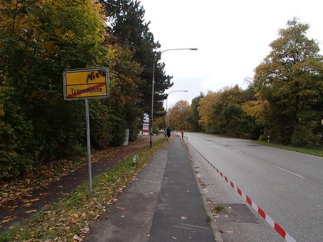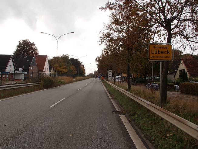 Travemünder Allee 10.17 Uhr / Km 2,7 Eindeutig Herbst. Das Wetter war eigentlich gut. Bewölkt bis sonnig und mit 15° bis 17°C sogar warm für Ende Oktober. Allerdings war die Vorhersage viel schlechter gewesen und ich war wohl eine Lage zu dick angezogen. Naja, aber noch hatte ich Rückenwind. Bis an die Ostsee sollte ich Wind von hinten haben. Da war dann die Wende... Vielleicht also doch nicht zu dick angezogen... ? Foto: |