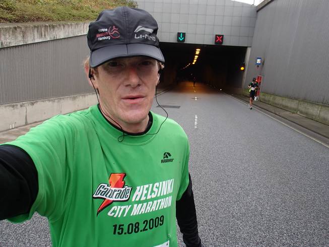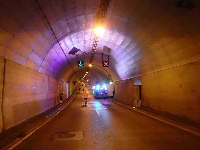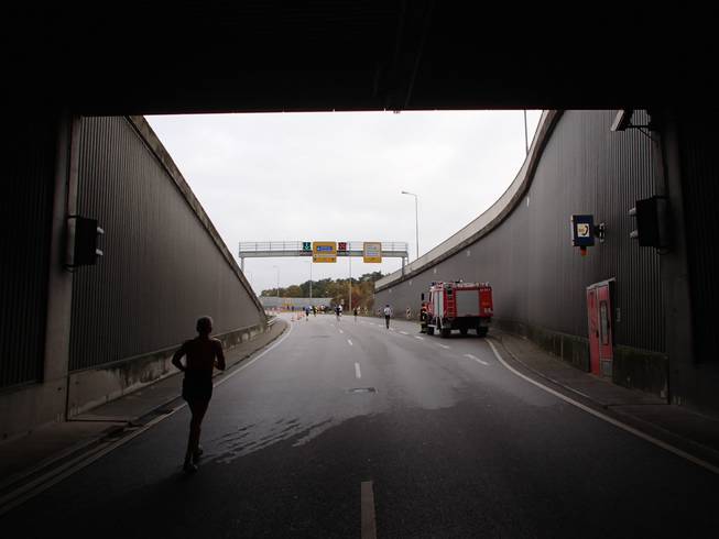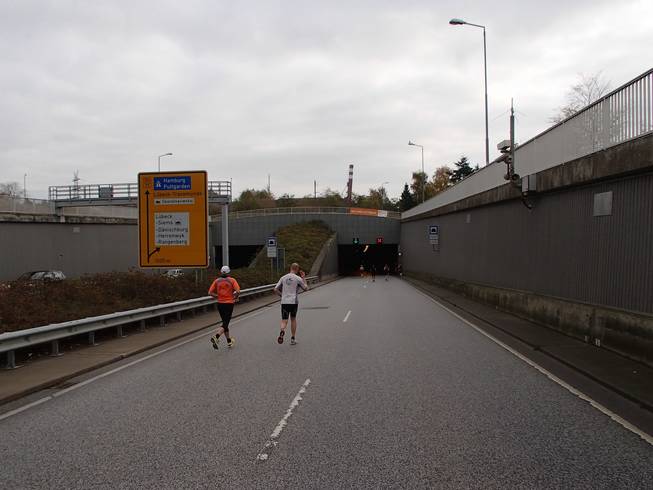 Travemünder Allee 10.50 Uhr / Km 8,5 Für Läufer war der Tunnel auch gratis, man mußte allerdings selbst laufen. Naja... gratis? Man zahlte mit Höhenmetern. |